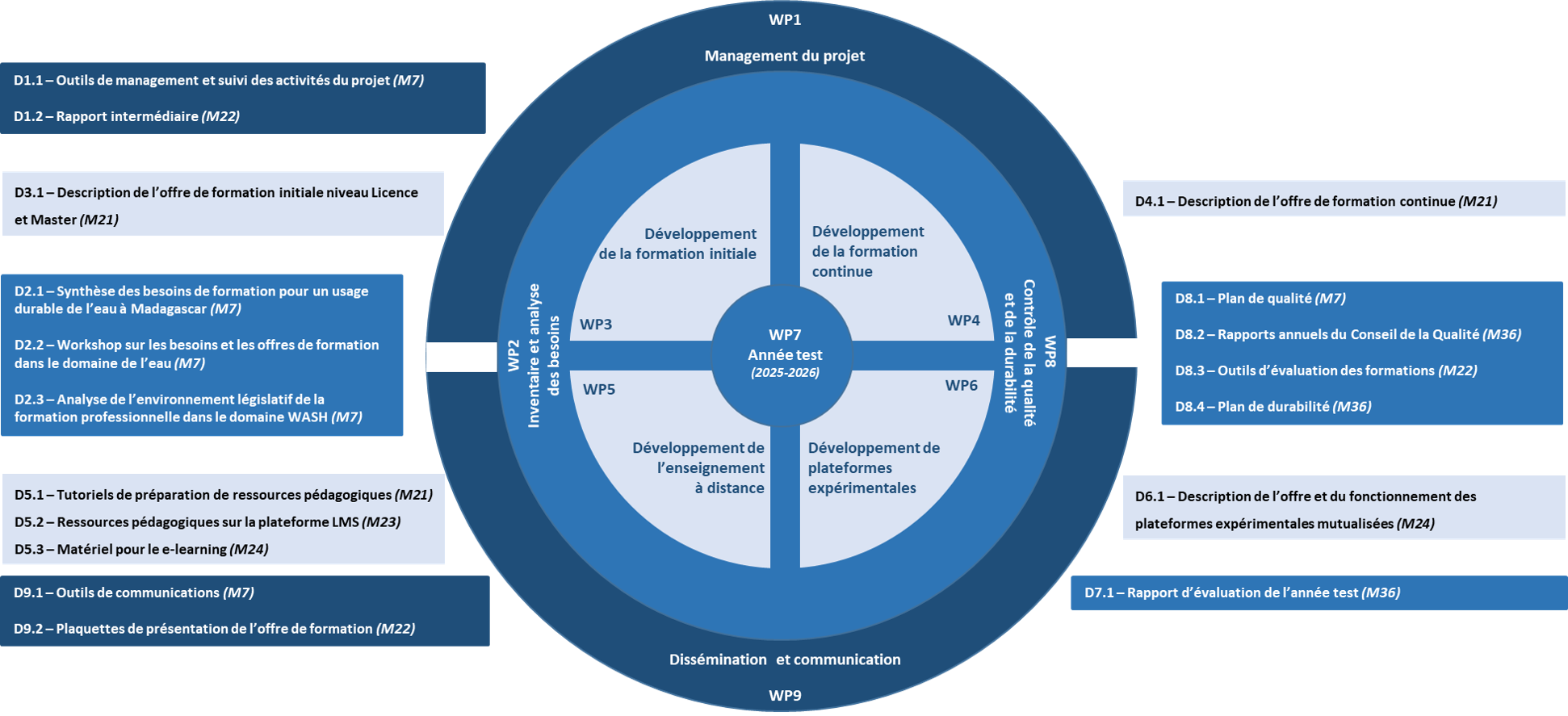 A l’exception du WP1 dédié au pilotage du projet et animé uniquement par UNILIM (équipe de coordination), chaque WP est piloté par un partenaire malgache et co-piloté par un autre partenaire (Malgache ou européen selon le WP). Les leaders ont été déterminés en fonction de leur expérience sur les terrains et/ou de leur rôle principal dans le WP afin de guider les partenaires les moins expérimenté permettant ainsi une mise en œuvre fluide des activités du WP.